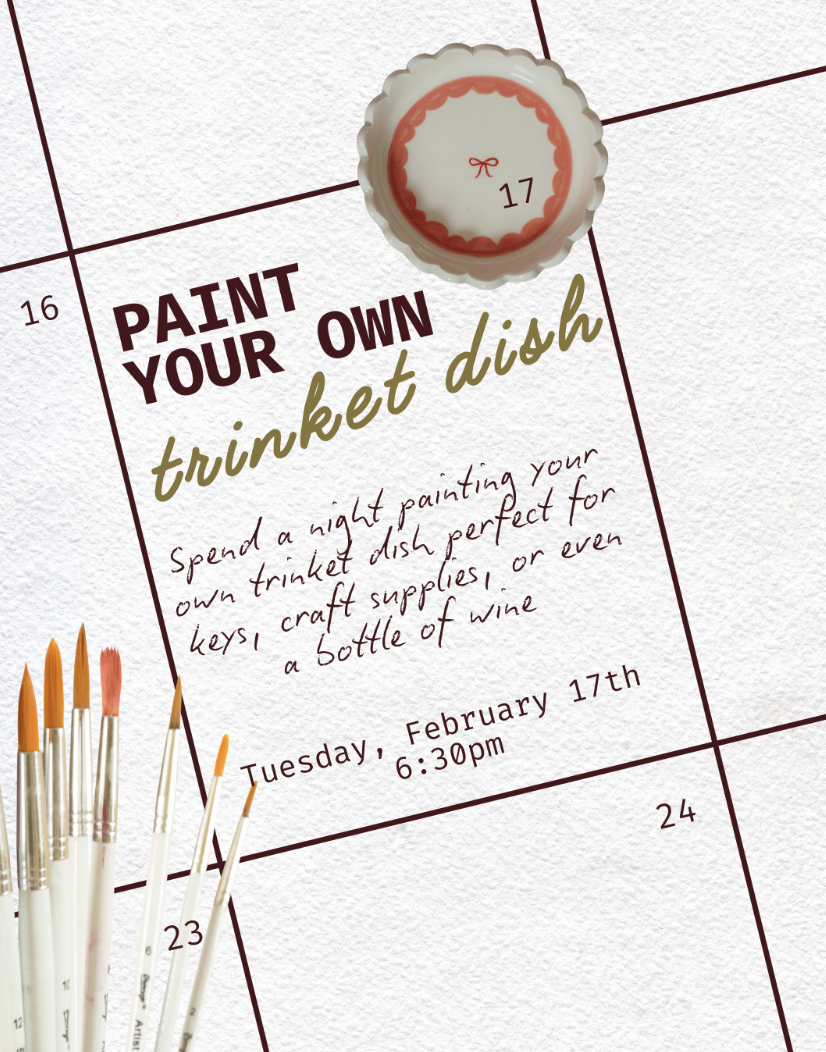 Join Goldie Ceramics to paint your very own trinket dish perfect for holding craft supplies, keys, or even a bottle of wine! We will provide supplies, instruction, and inspiration on how to paint a dish that will fit perfectly on your craft table. Perfect for all skill levels.