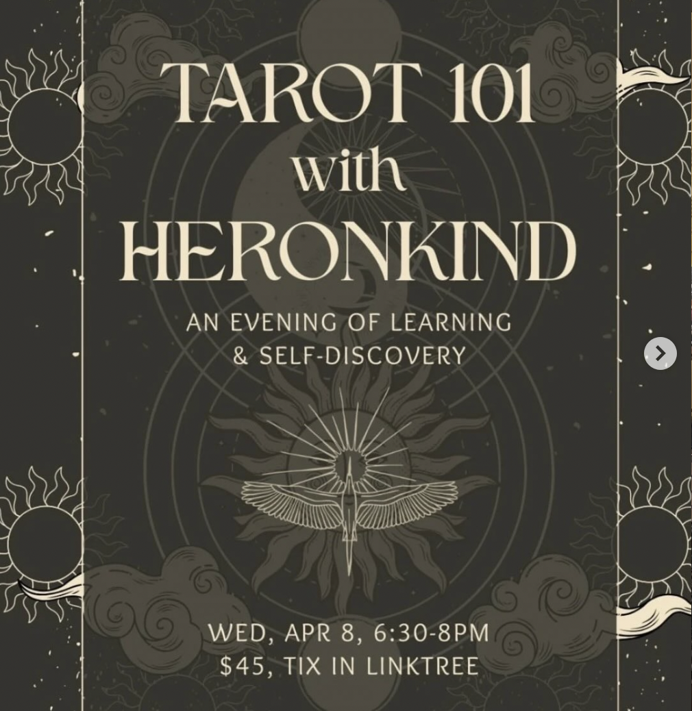 Join experienced professional tarot reader Lauren from Heronkind Stories & Healing for this tarot class and workshop at SQBG!