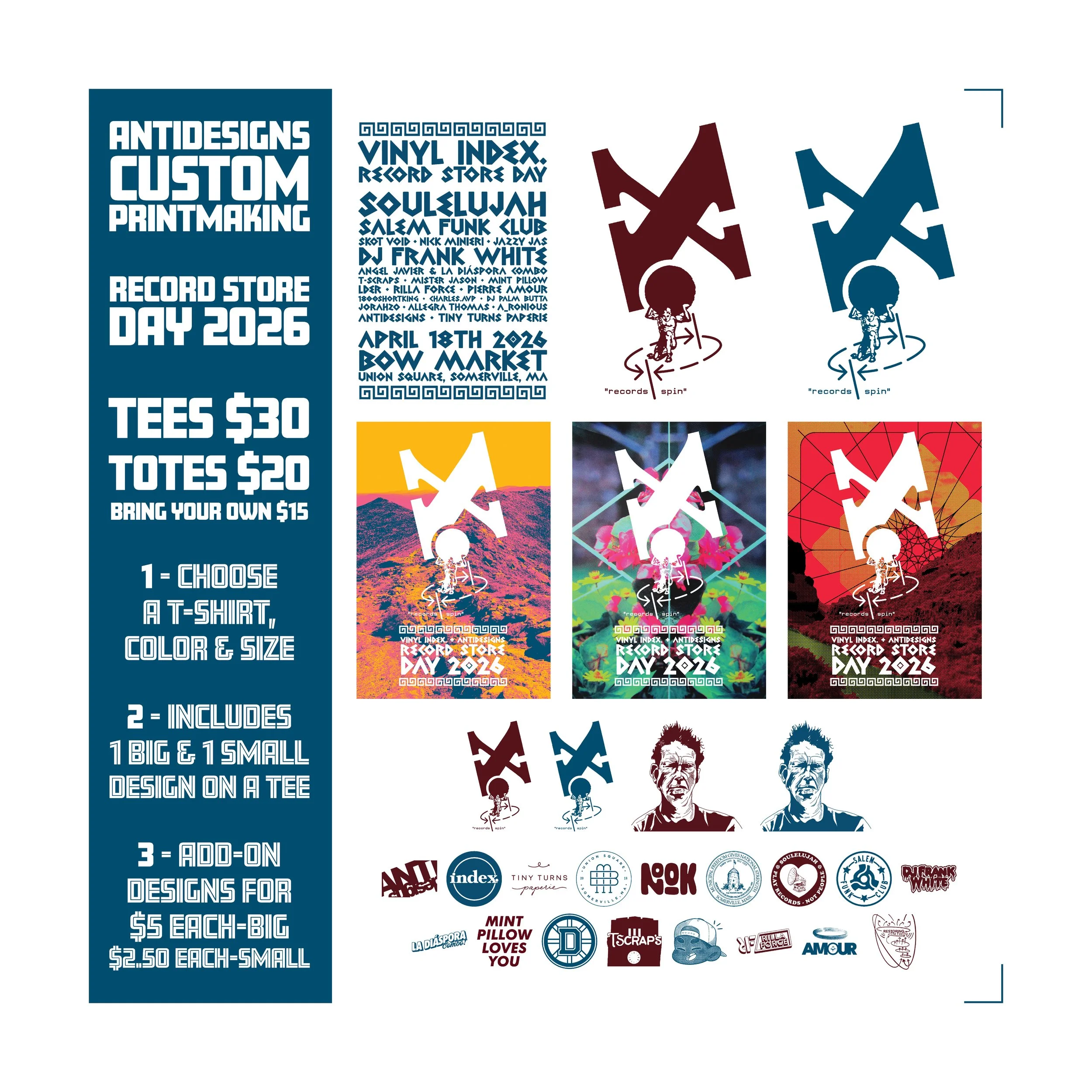 On Saturday, April 18th, Vinyl Index hosts its annual bash throughout Bow Market, with DJ sets all day, music-inspired food, drinks & merch from the Bow Market shops, including exclusive designs pressed live on tees & totes by AntiDesigns, and, of course, lots of records!