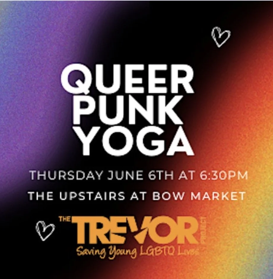 In Celebration, Health Goth Yoga is hosting a Queer Punk Pride Flow at the Upstairs at Bow. This will be an all levels flow to fundraise money for the Trevor Project. The class will incorporate movement with variations for new and seasoned practitioners. In honor of punk queer musicians, the class will be set to a curated playlist of punk and alternative bands like Sleater-Kinney, Laura Jane Grace and more!