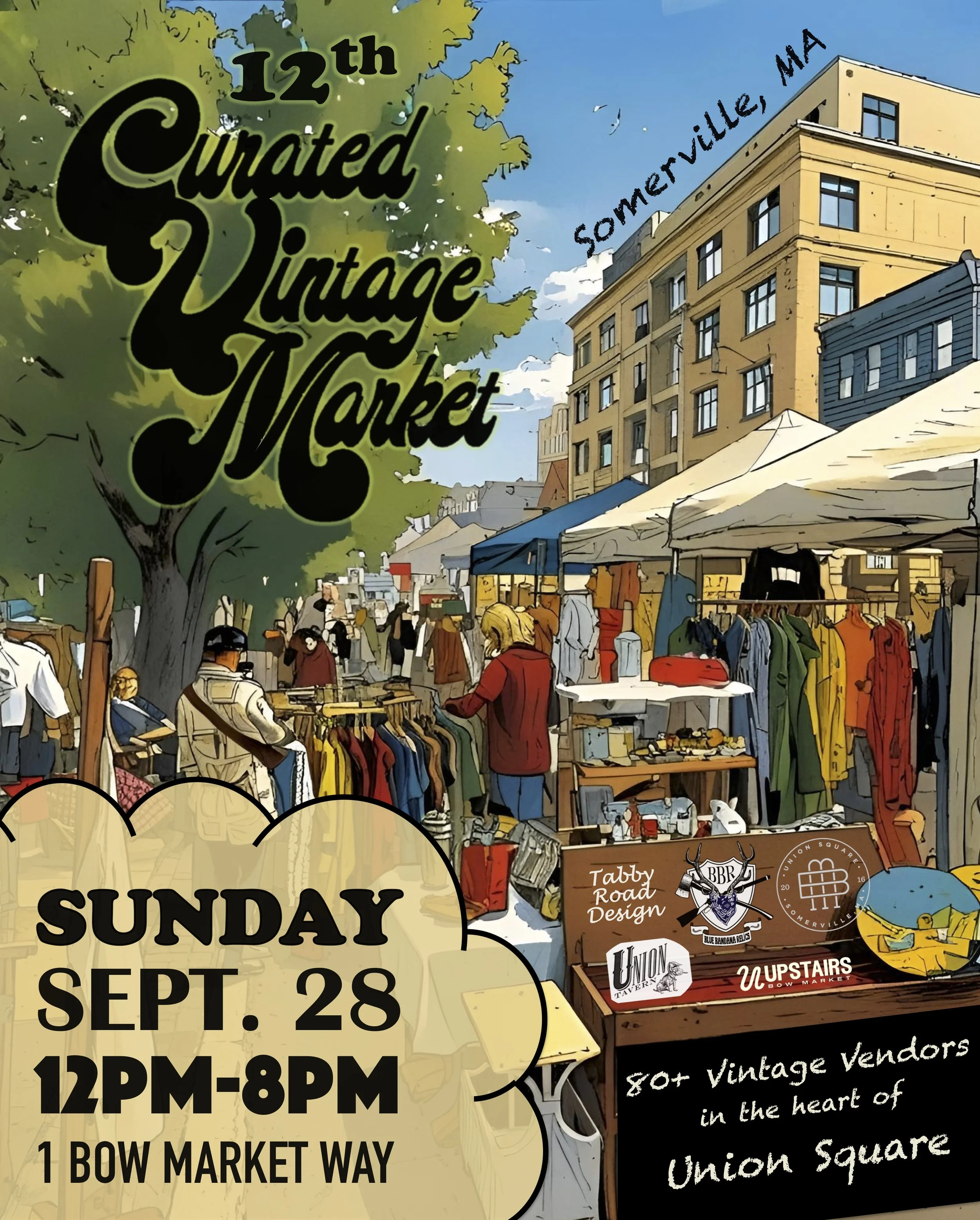 We'll see you on Sunday, September 28th as we return to our home field for our 12th Curated Vintage Market! This year we are taking over Somerville Ave, Bow Market + Union Tavern w/ over 80 vintage vendors from New England + beyond. Don’t miss this gathering of greats bringing the best & baddest vintage finds to the heart of Union Square, Somerville. Hosted by Blue Bandana Relics, Tabby Road Design, Bow Market, Upstairs at Bow & Union Tavern.