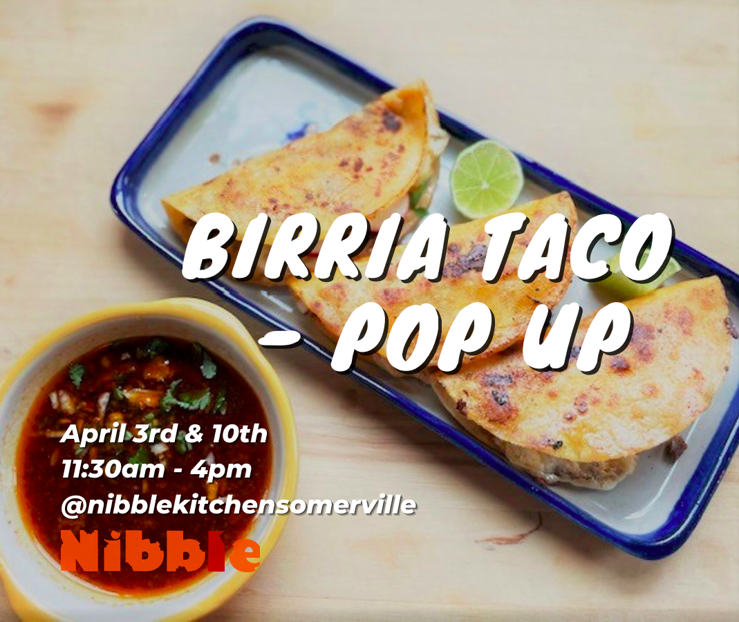 Nibble Kitchen Presents: Taquisimo, Tijuana-Style Birria Tacos. Come enjoy Birria, the saucy stew originally from Mexico. Taquisimo will serve the Tijuana-style Birria, made with beef, and serve it with broth for dipping, and two types of salsas—one called salsa macha that features peanuts, sesame, and salsa roja, with dried Morita chiles.