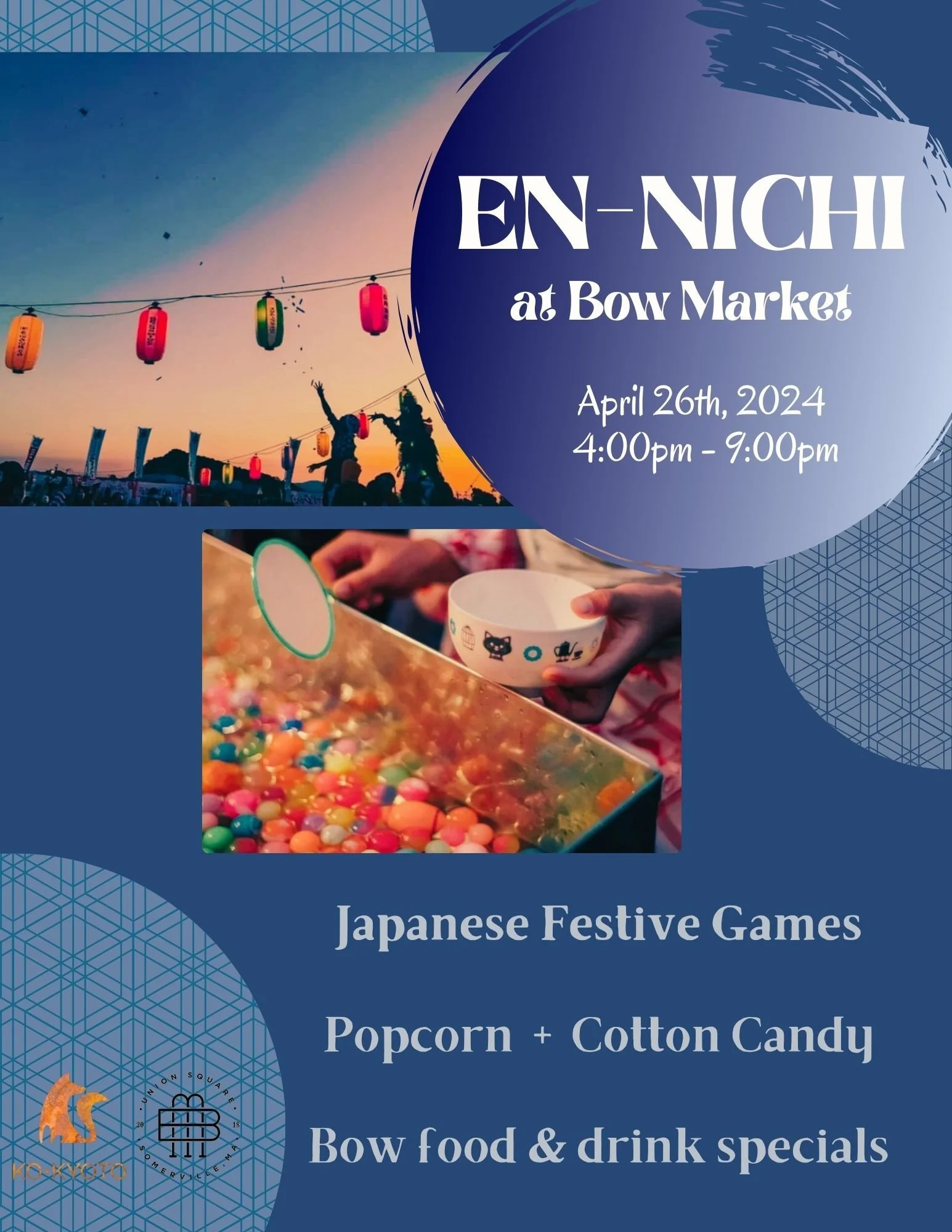 On Friday, April 26th, from 4pm - 9pm, the Bow Market courtyard will be filled with fun and joy for all - from children to adults hosted by Ko-Kyoto. There will be food, music, dance, games, and merriment. Join us and enjoy our old fashioned EN-NICHI Japanese festival!