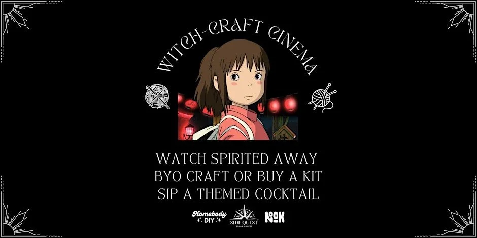 Side Quest Books & Games is hosting a Spirited Away viewing party with themed cocktails from our friends at Nook. Bring a craft or purchase a Homebody Kit and settle in for a cozy night of witchcraft.
